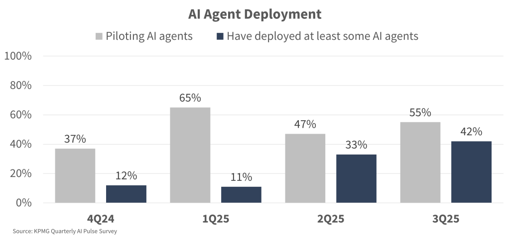 Autonomous agents, often referred to as “agentic AI,” are emerging as the next frontier in artificial intelligence. These systems use multi-step reasoning and a coordinated set of AI tools to autonomously and reliably complete employee workflows. As models become smarter, they can support a wider set of workflows with higher reliability, while growing compute capacity drives down costs and enables more ubiquitous agent deployment. Each new datacenter might support millions of these agents as they begin automating workflows across corporate America. We believe these AI agents will be the “killer app” of artificial intelligence and in many ways are already reshaping productivity across corporate America. A recent MIT simulation (Project Iceberg) tracking 151 million US workers across 32,000 skills and 923 occupations found that AI can technically replace 11.7% of the American workforce today, affecting $1.2 trillion in wages. We expect to see additional corporate earnings on the back of margin expansion as companies leverage these AI tools to reduce labor costs. In a recent survey of CEOs taken by Yale’s School of Management, 66% of leaders surveyed said they planned to either reduce headcount or maintain the size of their teams in 2026. Only 1/3 said they plan to increase headcount.