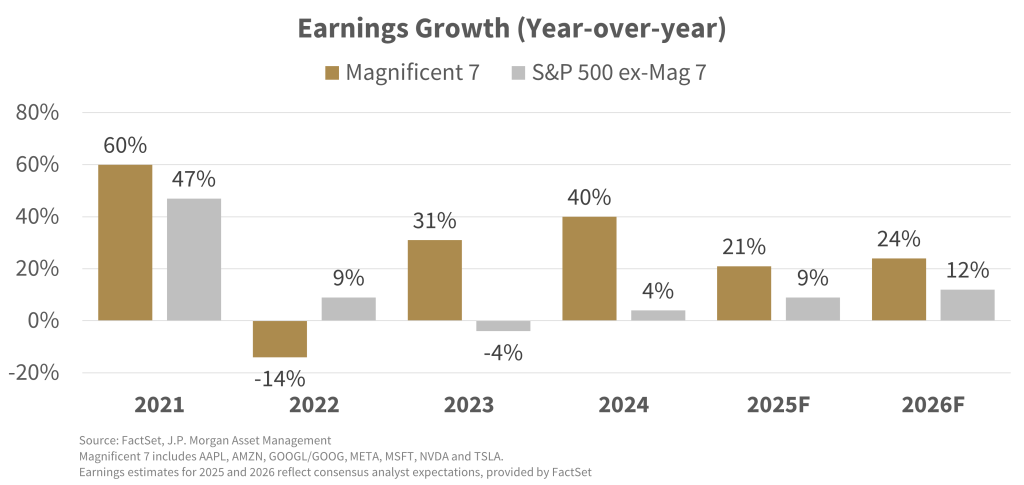 In the United States, these strong returns matched the strong earnings growth produced by American companies alongside almost record profit margins. The Magnificent 7 tech stocks again led the charge in markets, rising 23% versus 13% for the S&P 493 in price terms, supported by 21% earnings growth (vs. 9% for the rest). International markets mirrored this trend, with semiconductor and AI-related companies as top contributors.